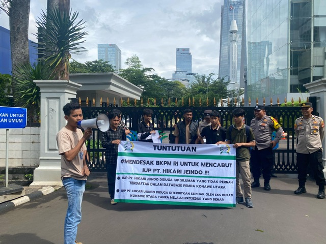 JAKARTA, Sultrust.com – Aliansi Masyarakat Peduli Hukum (Ampuh) Sulawesi Tenggara (Sultra) kembali menggelar aksi demonstrasi di Kementerian Investasi / Badan Koordinasi Penanaman Modal (BKPM) RI pada Rabu, 19 Februari 2025. Aksi ini dilakukan terkait dugaan adanya Izin Usaha Pertambangan (IUP) siluman yang diterbitkan untuk PT. Hikari Jeindo.