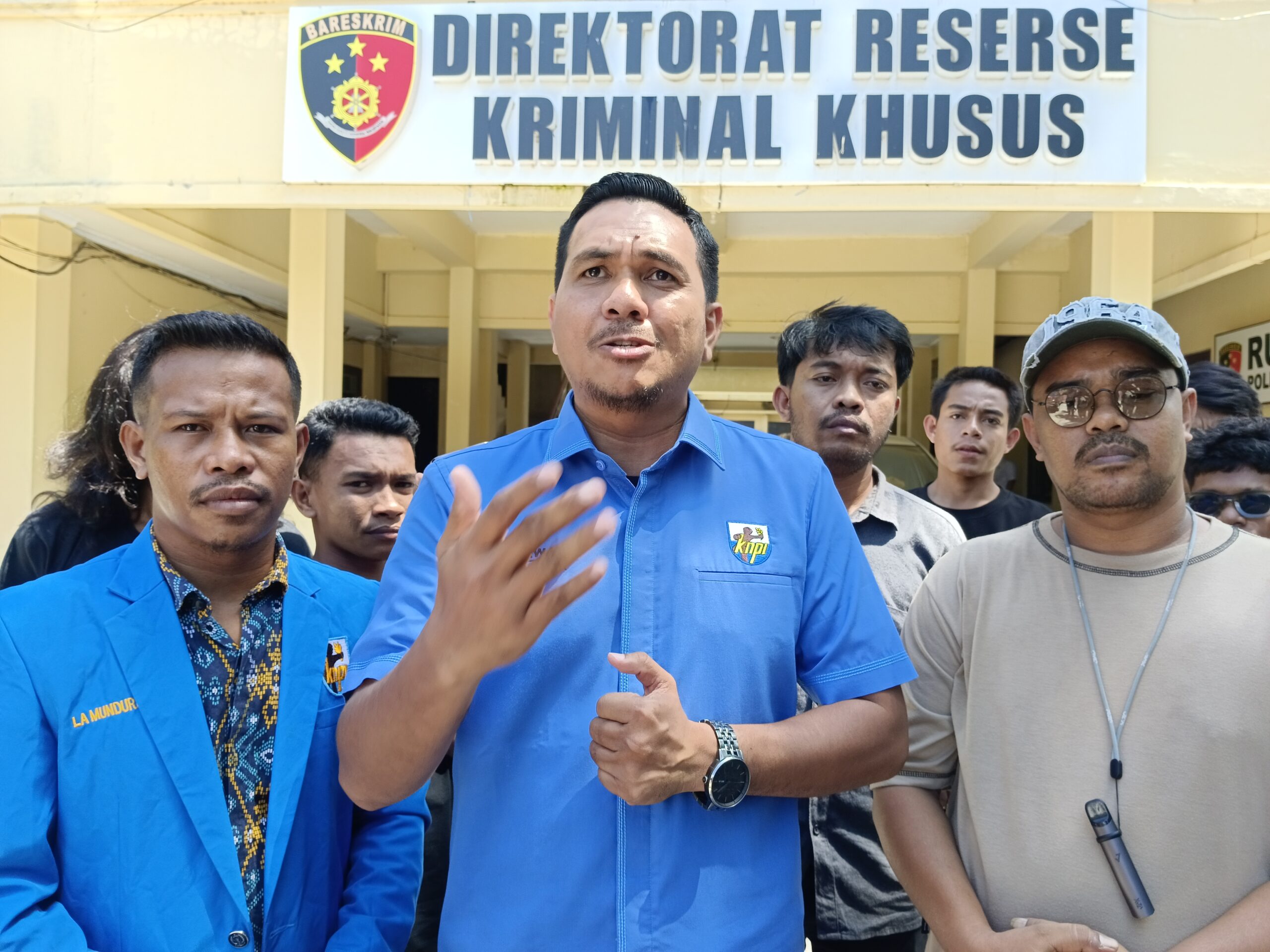 Ketua KNPI Sultra, Hendrawan Sumus Gia, saat membawa laporan tetkait dugaan Rasisme terhadap suku Muna di Mapolda Sultra. // Dok : Salman