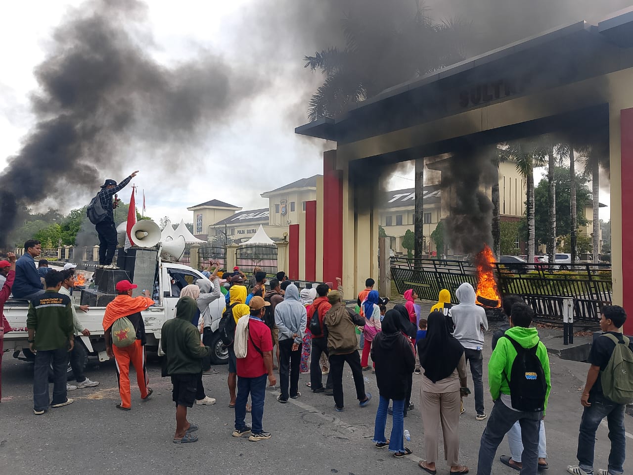 Ratusan warga Desa Bangun Jaya, Kecamatan Lainea, Kabupaten Konawe Selatan, bersama Aliansi Rakyat Pemerhati Keadilan (ARPK) mendatangi markas Polda Sultra, Rabu (17/9/2025).
