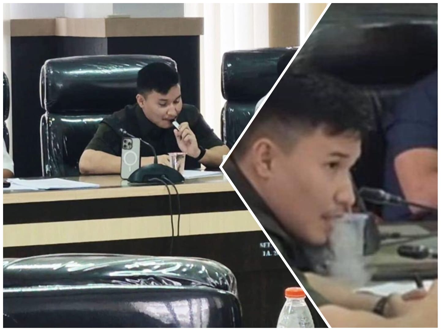Dalam video, Fadhal yang mengenakan kemeja hitam terlihat duduk tenang di kursinya, memainkan ponsel, dan beberapa kali mengisap vape. Ia tampak berusaha menahan asap agar tidak mencolok dan tetap mengikuti jalannya rapat hingga selesai.