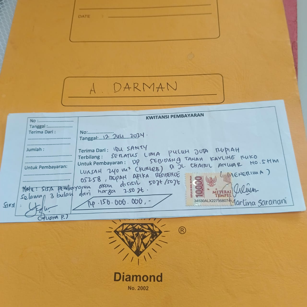 Dalam kwitansi disebutkan pelunasan dilakukan tiga bulan setelah pembayaran pertama atau sekitar Oktober 2024. Namun, pada 7 November 2024, Santy kembali diminta menambah uang Rp15 juta untuk biaya pengukuran tanah. Dana itu dijanjikan akan dipotong dari sisa pembayaran harga lahan.