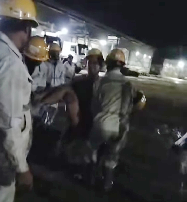 Proses evakuasi salah satu karyawan PT VDNI yang meninggal akibat ban dump truck meledak. Foto : ist.