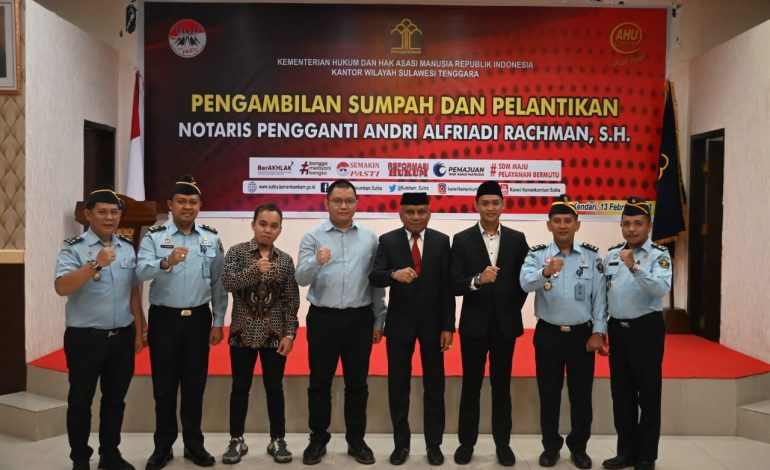 SULTRUST.ID – Kepala Kantor Wilayah Kementerian Hukum dan HAM (Kakanwil Kemenkumham) Sulawesi Tenggara (Sultra), Silvester Sili Laba, melantik Notaris Pengganti, yakni Andri Alfriadi Rachman, menggantikan Notaris Wandhi Pratama Putra Sisman yang berkedudukan di Kabupaten Kolaka, Senin (13/2/2023).