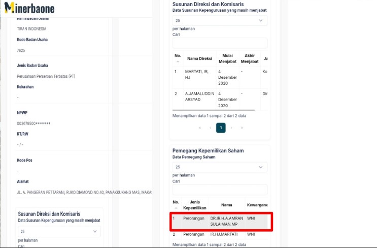 Data Minerba One Data Indonesia (MODI) ESDM, Menteri Pertanian, Amran Sulaiman memiliki saham di PT Tiran Indonesia yang beroperasi di Konawe Utara. (Istimewa)