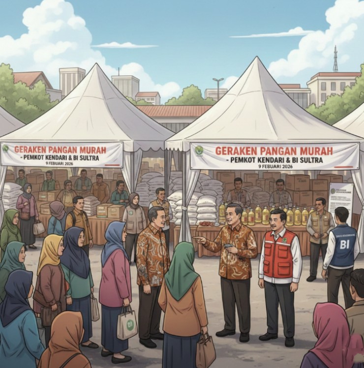 Ilustrasi gerakan pasar murah yang diselenggarakan oleh BI Sultra bersama pemkot Kendari guna mencegah inflasi jelang ramadhan 2026. (By Gemini AI)