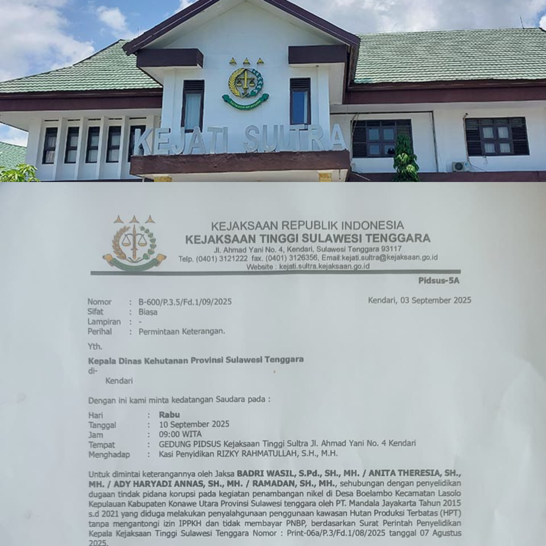 Surat panggilan bernomor B-600/P.3.5/Pd.1/09/2025 mengagendakan pemeriksaan pada Rabu, 10 September 2025, di kantor Kejati Sultra. Kadishut akan dimintai keterangan oleh tim jaksa yang terdiri dari Badri Wasil, Anita Theresia, Ady Haryadi Annas, dan Ramadan.
